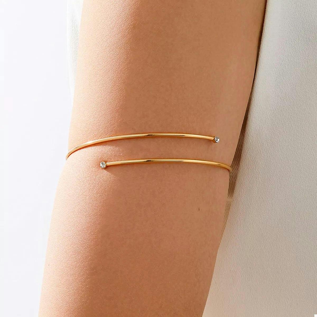 Elevate your style with the Delicate Gold Wire Upper Arm Bracelet. This chic jewelry piece features a stunning 18K gold-plated design that catches the light beautifully. The elegant arm adornment showcases intricate details, making it a unique ornament for any outfit.